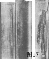 圖16滲碳層(硬化的表面)壓碎,表現(xiàn)在該錐形齒輪接觸表面上是縱長(zhǎng)的裂紋.主要的裂紋從滲碳層心部結(jié)構(gòu)的深處開始,慢慢向表面延伸。