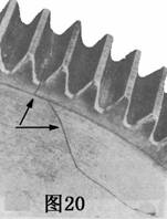 圖20是一個(gè)從齒根圓角伸展到齒輪中心孔的疲勞裂紋,需要金相的檢查以確定造成缺陷的起因。