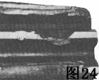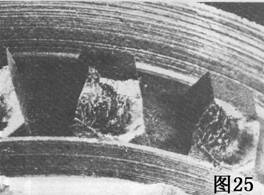 圖24中行星齒輪的大部分齒頂已碎掉。作業(yè)載荷產(chǎn)生的應(yīng)力在這個(gè)點(diǎn)引起裂紋。最后,可能是由于疲勞,這些裂紋繼續(xù)發(fā)展,直到齒的表面。如果這是在短的使用之后發(fā)生的,可能表面硬化深度過大,需要作金相檢查來作出判斷。