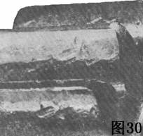 圖30所示為中等硬度齒輪由于碾壓和敲擊作用而造成的表面變形。這個(gè)齒輪很可能是受到超載荷,并且在有了初步的損傷之后長(zhǎng)期使用,造成表面敲壞。